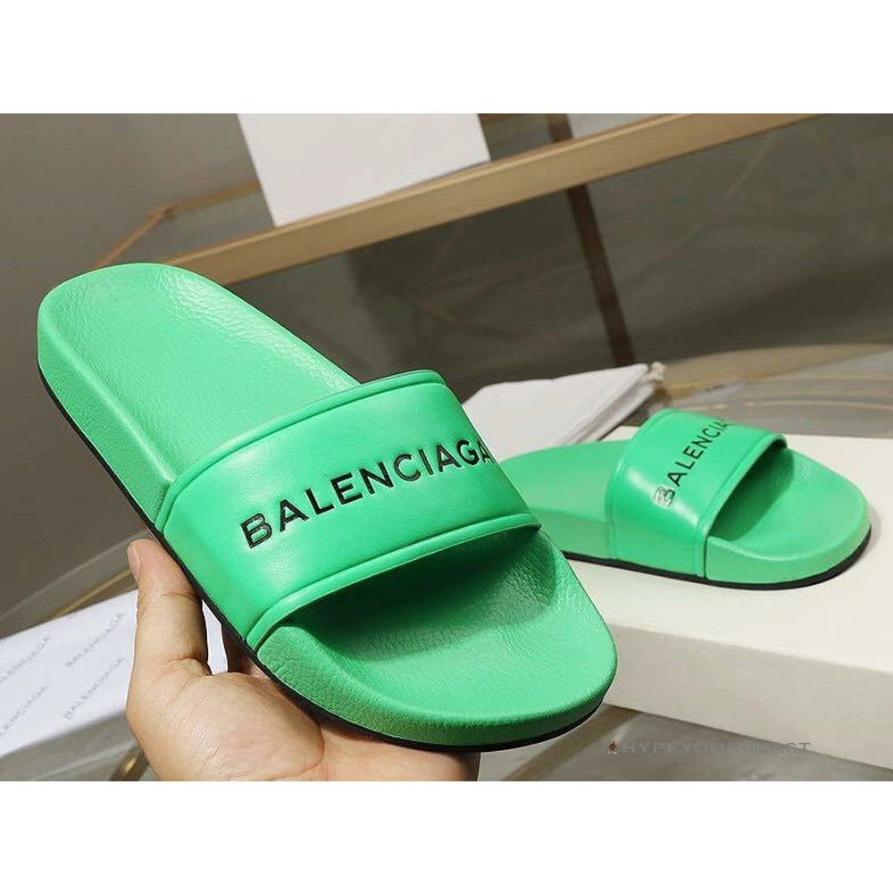Balenciaga Slides Green is a pair of slip-on footwear that carries a striking green tone. Its green theme outshines other slides. Moreover, these sneakers also highlight the Balenciaga logo on its strap. Balenciaga Slides Green footwear is completed with black rubber outsoles.